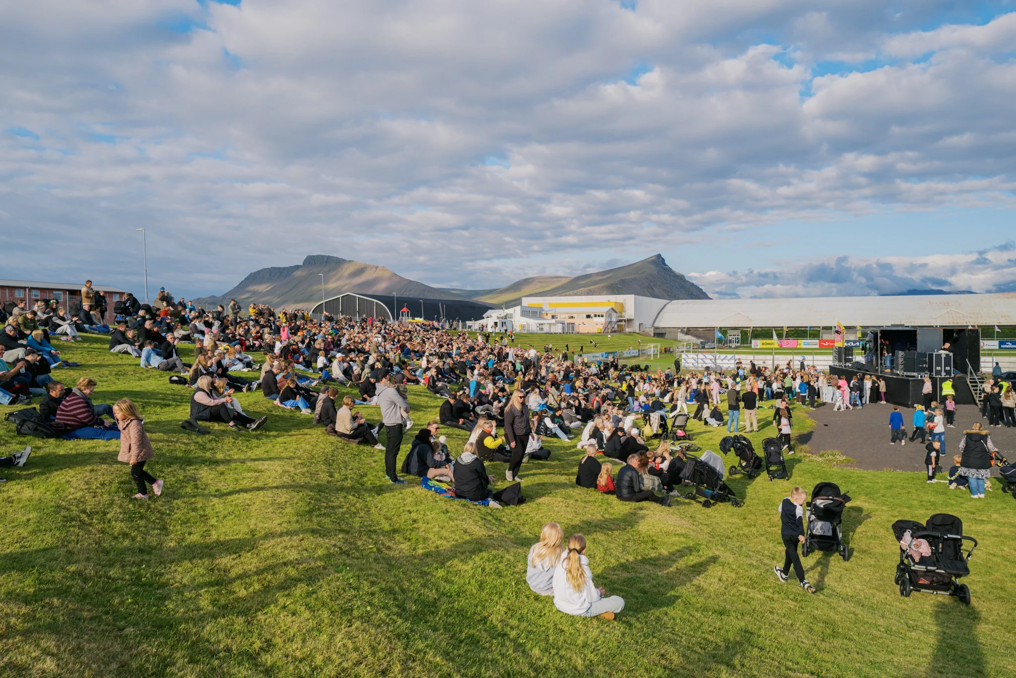 People gathered on a grassy hillside in front of a stage with mountains in the background, attending an outdoor event or concert during the daytime with partly cloudy skies.