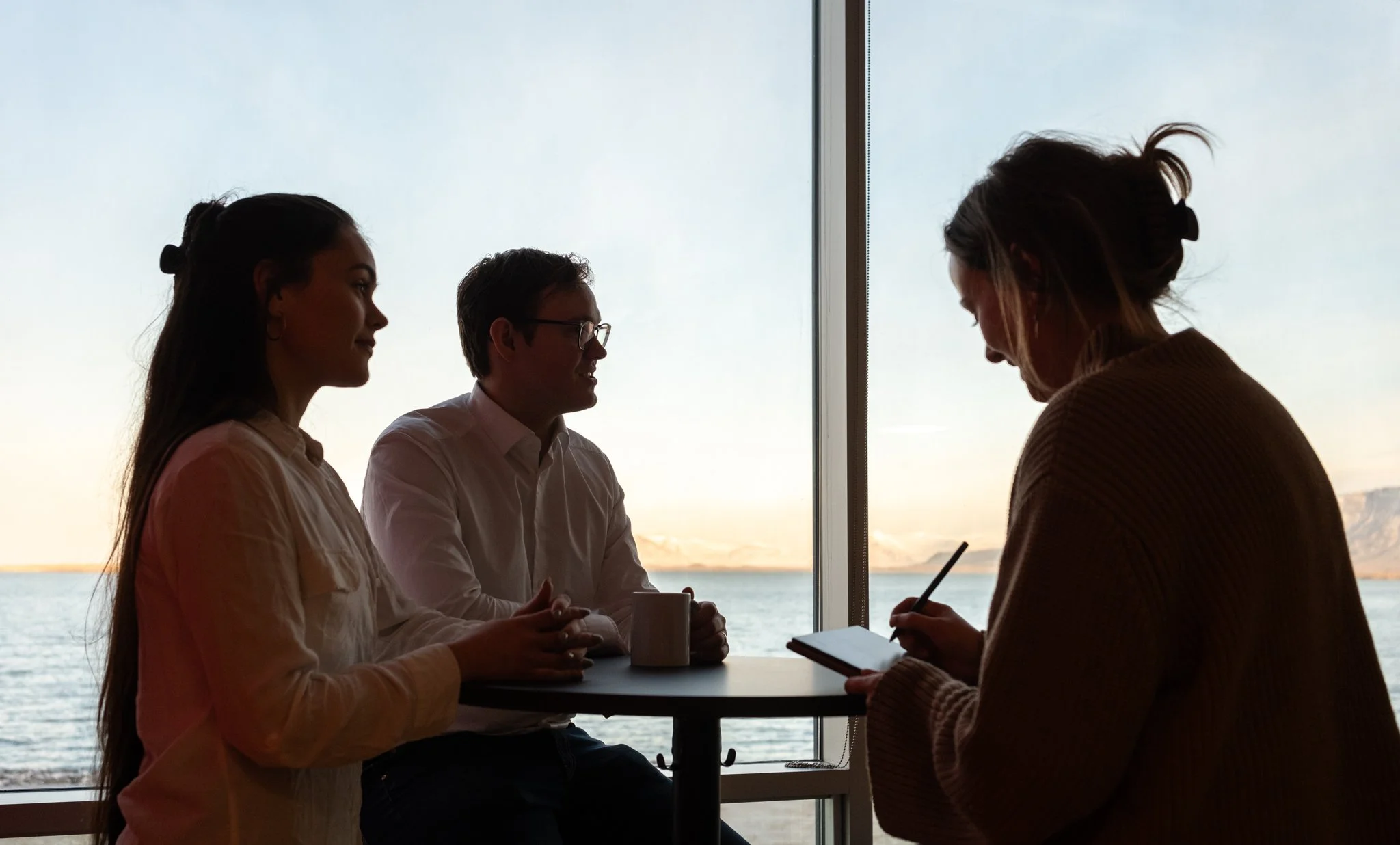 Three people sitting at a table by a large window with a body of water and mountains in the background, two women and one man, engaged in conversation, with one woman taking notes.